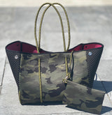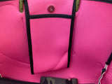 Bubble Gum Pink Stripe Camo Neoprene Bag features bubble gum pink and a light pink stripe one one side and a solid camo print on the other. Removable wristlet pouch, snap closure and 1 inside poctet. Snaps on both sides of bag to make smaller if needed/wanted.