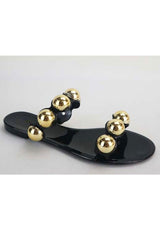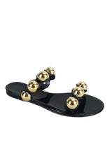 Bubble Jelly Sandal features a metal bubble accent on a two strap open toe sandal. We love this shoe to add something extra to any outfit! Pair with your favorite leggings, skinny jeans or shorts.