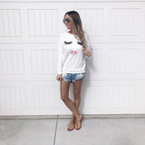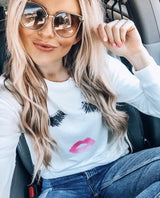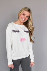 Eyelash Pullover features a brushed knit with lashes and lips printed on front. This item is true to size with a slight slouchy fit.