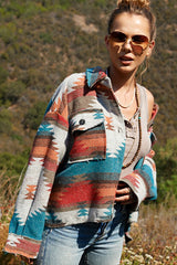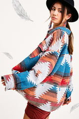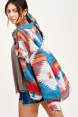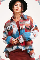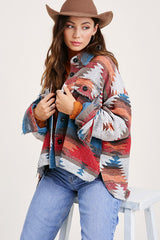 Functional yet fashionable Forbidden Woods Jacket! We've given the jacket a slightly cropped body and an aztec print all over for an unique look. Made of lightweight soft brushed fabric, featuring a collared neckline and long sleeves with dual patch pockets, button-down closure, high-low hem. Boxy, cropped bodice ends in a distressed, raw hem that wraps around to a concave.