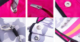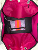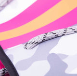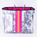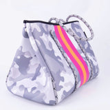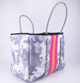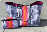 Grey Camo Neoprene Bag features orange and pink stripes printed on a grey camo bag. Removable wristlet pouch, snap closure and 2 lined zipper compartments. Snaps on both sides of bag to make smaller if needed/wanted.