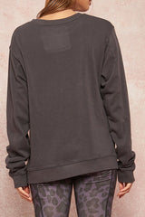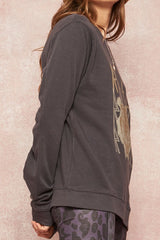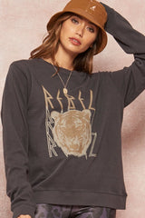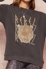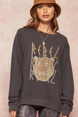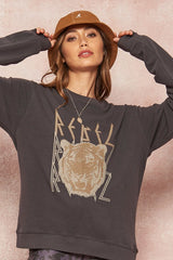 Rebel Tiger Vintage Graphic Sweatshirt is a garment dyed french terry graphic sweatshirt featuring a vintage style tiger graphic print with "Rebel" text. Round neckline. Long sleeves. Dropped shoulder. Ribbed neckline, cuffs, and hem. Relaxed fit.
