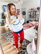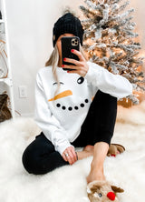 Snowman Sweatshirt features our a winking snowman printed on front. True to size. Size up for a boyfriend fit.