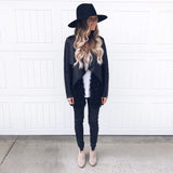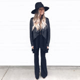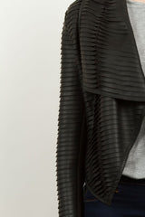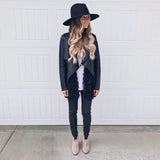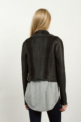 Faux Leather Jacket features layered strips of vegan leather with a drape front. 1 button and 1 hook and eye closure in front.