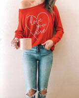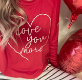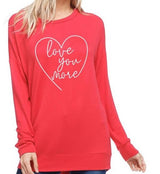 Love You More Pullover features a french terry long sleeve light weight material with "Love You More" printed on front in a heart. This item has a slightly oversized fit.