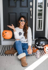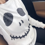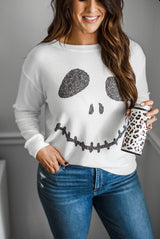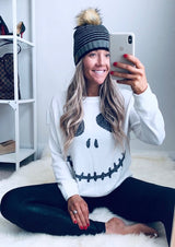 Skelly Smile Pullover features a brushed knit with a skelly smile print on front. True to size.