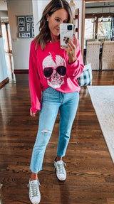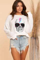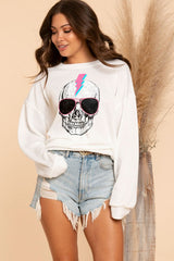 Lightening Sunglass Skull Sweatshirt features an oversized fit with a skull print with sunglasses and thunder bolt. Lightweight and oh so soft!